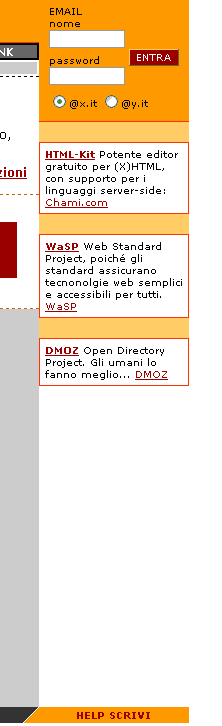 Nella colonna di destra ci sono il modulo per accedere alla posta elettronica e dei box per gli sponsor. Questi ultimi sono di scarso interesse e sono stati implementati in modo simile a quanto fatto per le classi .spot. Più interessante è invece la sezione #emailform. Le dimensioni dei campi sono state regolate impostando il carattere, la larghezza dei campi tramite le classi loro assegnate. Il pulsante è stato realizzato impostando il colore dello sfondo e del testo. L'allineamento alla destra dei campi si è ottenuto allineando la classe che contiene il pulsante (enter) e regolandone il margine superiore (-62px). L'allineamento verticale risulta centrato per IE ma non per NN e Opera.